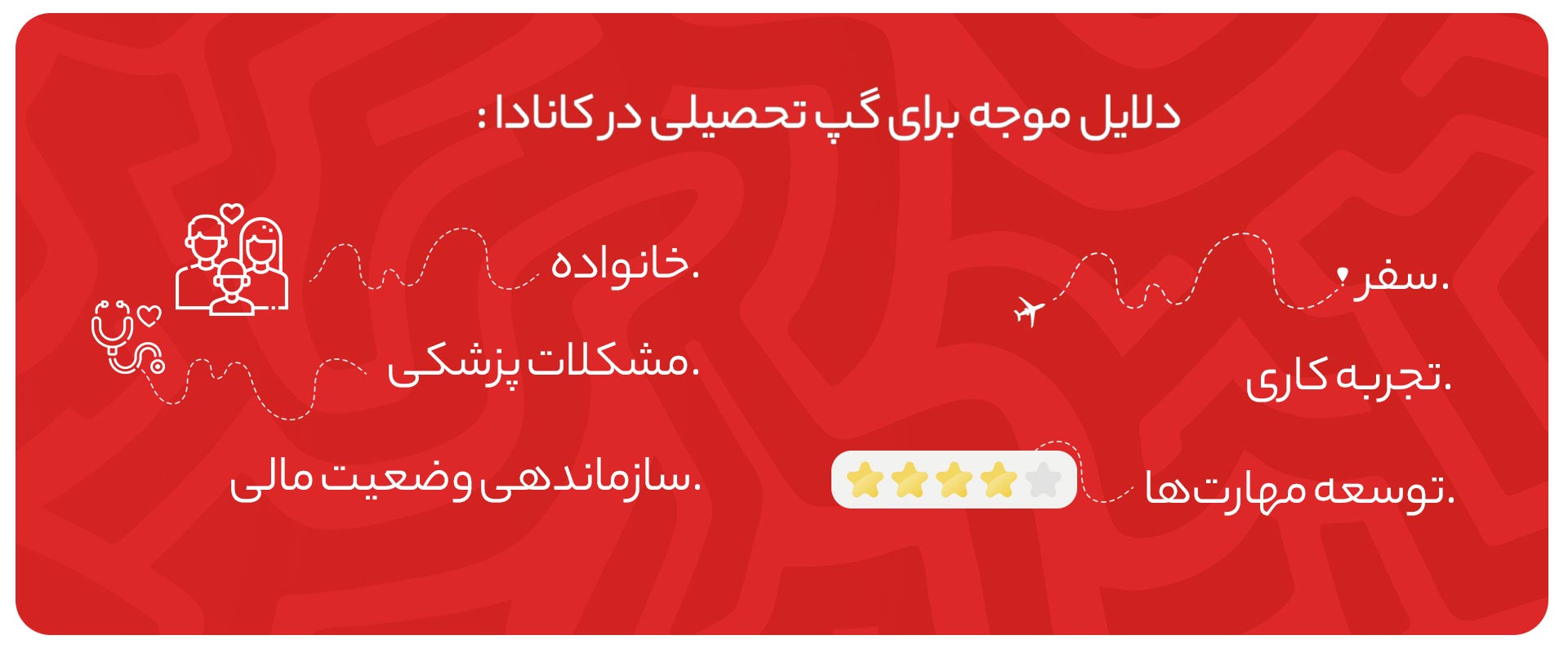 - استفاده از یک سال گپ تحصیلی برای حل مشکلات خانوادگی یا مالی. بدین ترتیب، میتوانید در طول حضور در کانادا و دوری از کشور مبدا، با خیالی آسوده مشغول به تحصیل شوید. این موضوع همچنین به شما کمک میکند تا در موقعیتهای دشوار، عملکرد بهتری داشته باشید.